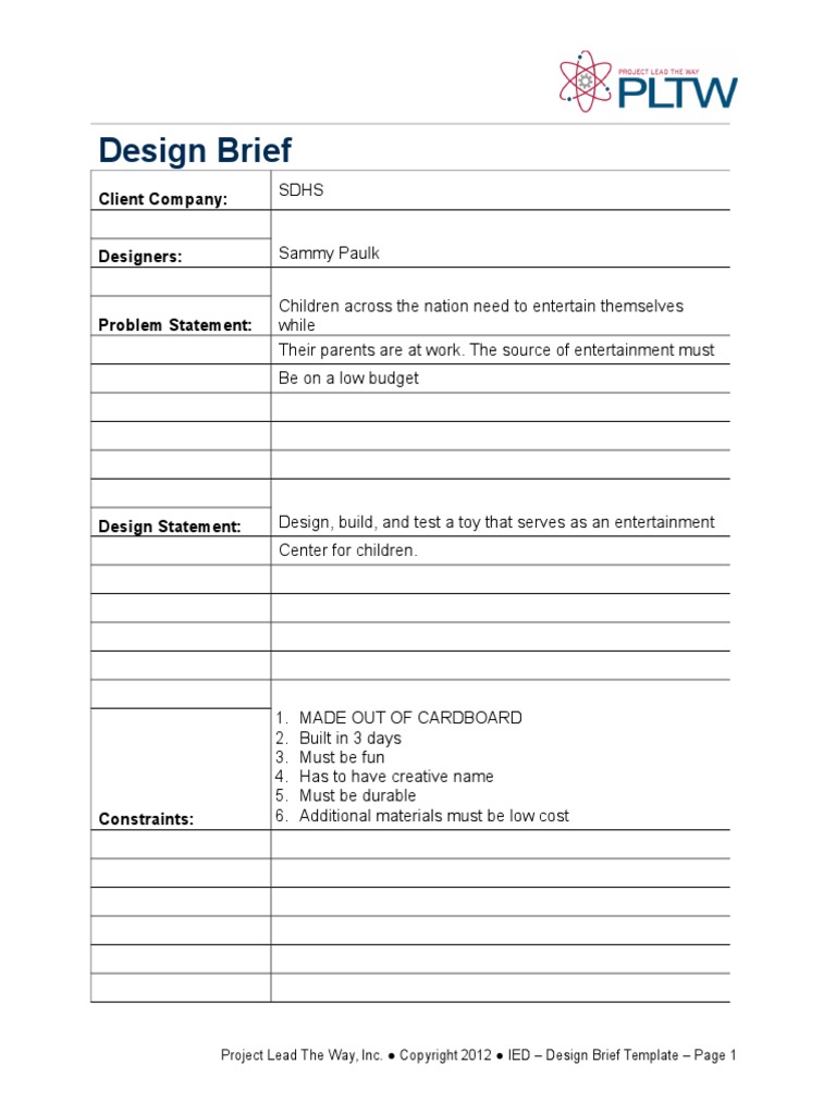 What Is A Design Brief Pltw Rectangle Circle from lh4.googleusercontent.com Research, design, model, and test a co 2 dragster to travel a distance of 60' track. Comparative relationship between elements in a design with respect to size. Activity 3.4.1b:design brief template subject: The statement must explain why the layout has been chosen and how it fits with its surroundings. Maximum material costs are $200 per table. When you record your work, write the number and title of each section as shown. The criteria) without describing the constraints or how to solve the problem, and (b) identifies the degree to which the solution must be executed. Pltw the design process steps 25 questions.